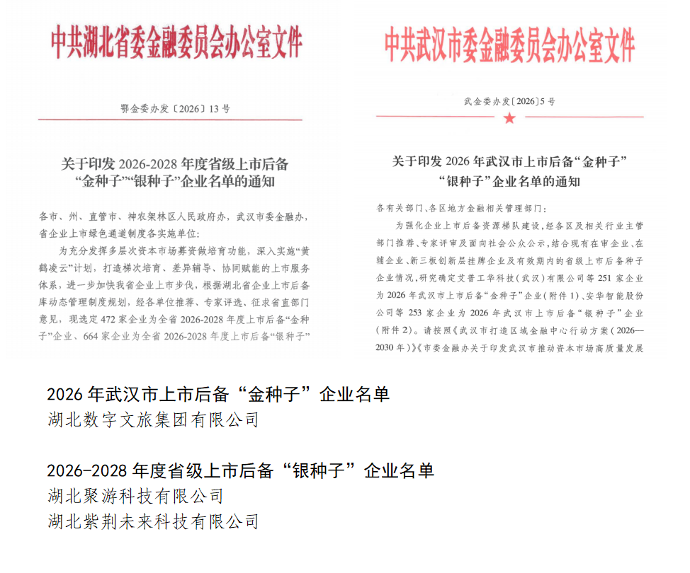 近日,湖北省委金融办公布2026-2028年度省级上市后备“金种子”“银种子”企业名单,选定472家“金种子”企业、664家“银种子”企业;武汉市委金融办公布2026年市级名单,选定251家“金种子”企业、253家“银种子”企业。其中,数旅集团入选市级“金种子”,聚游科技、紫荆未来公司双入选省级“银种子”及市级“银种子”。