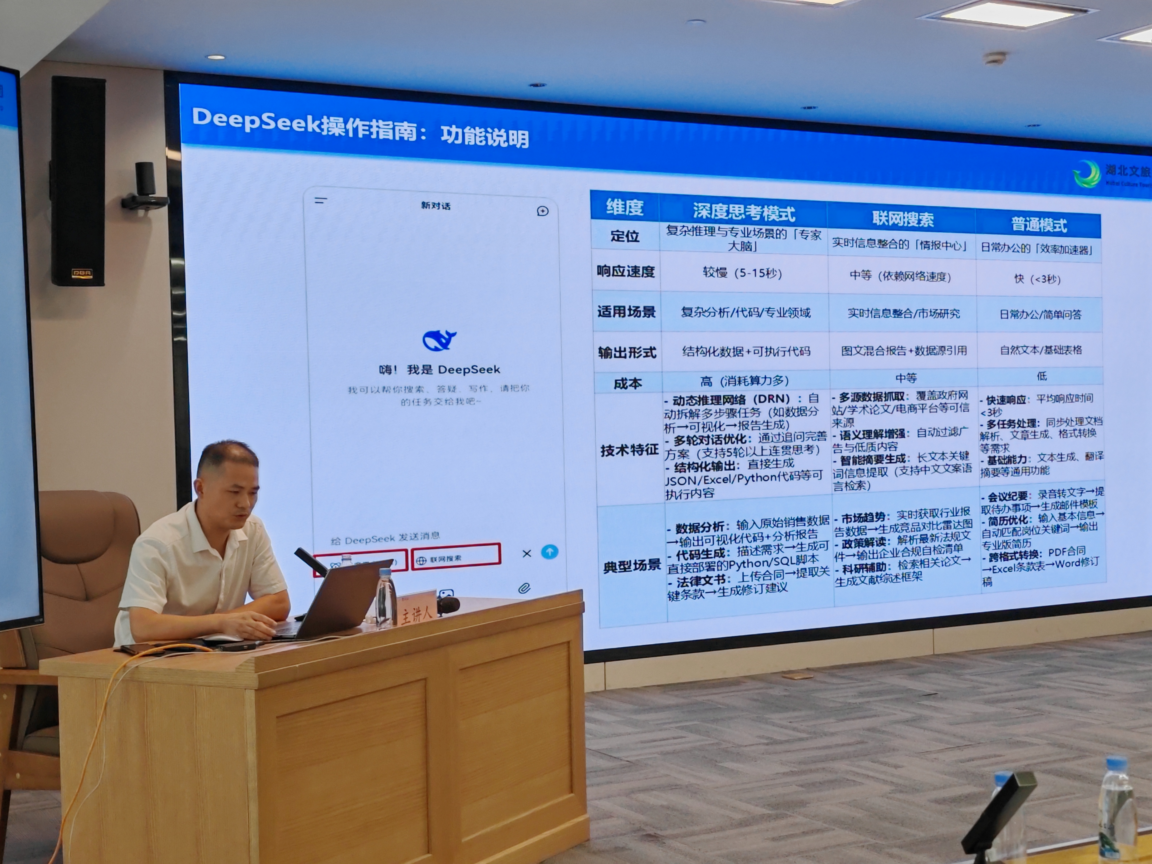 培训最后,公司集团业务事业部吴鹏以《解锁AI+DeepSeek在办公场景的实践与应用》为主题展开分享。结合办公实际需求,详细介绍AI+DeepSeek技术在文档处理、数据分析、PPT制作等办公场景中的具体应用场景与实践案例,演示该技术如何提升办公效率、降低人工成本、优化工作质量。