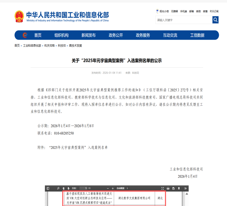 首例!数旅集团“逍遥武当”项目跻身两项全国典型案例名单。近日,工业和信息化部科技司、教育部科学技术与信息化司、文化和旅游部科技教育司、国家广播电视总局科技司联合公布了“2025年元宇宙典型案例名单”;工业和信息化部办公厅、文化和旅游部办公厅、国家广播电视总局办公厅、国家知识产权局办公室、中央广播电视总台办公厅联合公布了“2025年度视听系统典型案例名单”,数旅集团“逍遥武当”项目在两项典型案例评选中均成功入选。